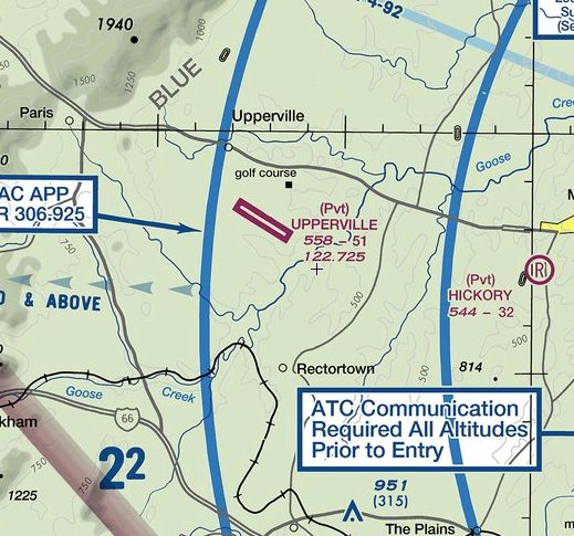 The 2023 Washington Terminal Chart depicted Upperville as an abandoned airfield.