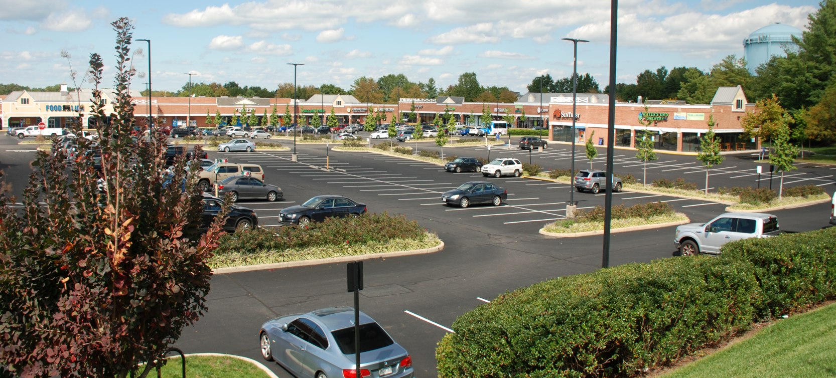 A 2018 aerial view looking northeast at the site of the former Manassas Airport, now occupied by the Manaport Shopping Center & houses.