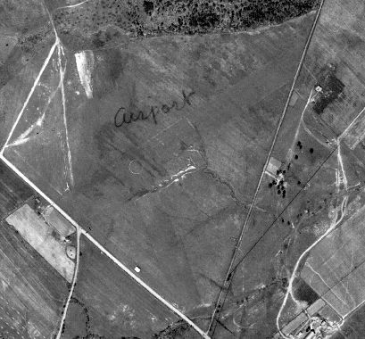 which depicted a single unpaved northeast/southwest runway, with a cluster of small buildings on the east side.