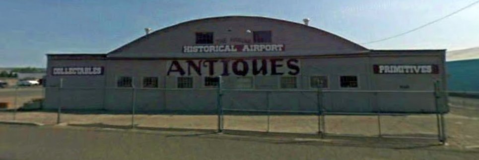 A 2019 photo looking south at the former Asotin County Airport hangar, reused as “The Hangar Antique Empoorium”.
