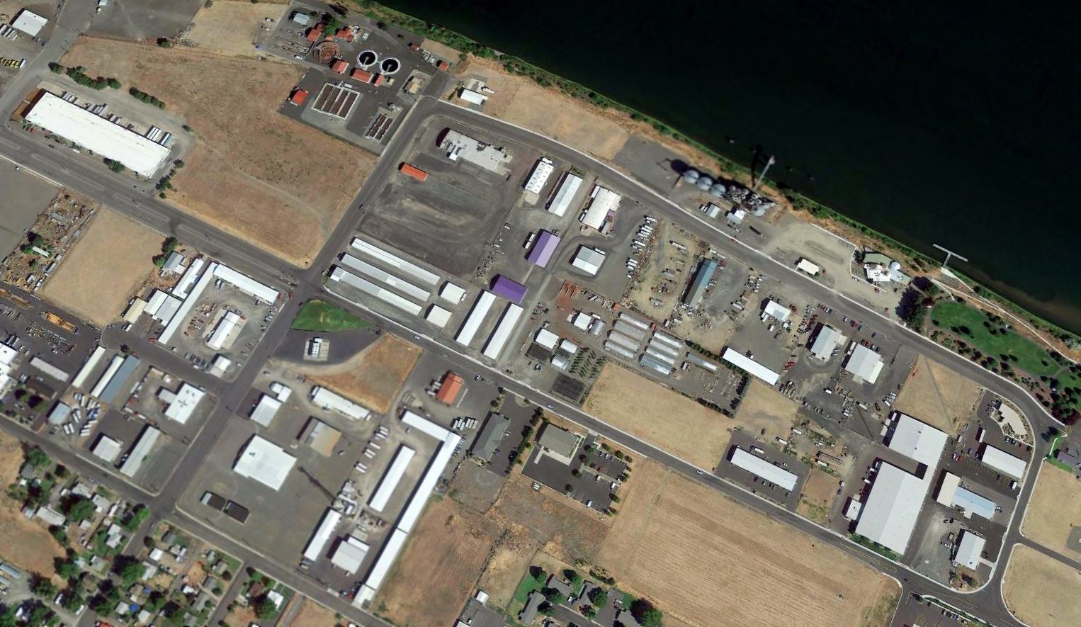 A 2015 aerial view looking northwest showed several buildings & streets covering the former Asotin County Airport runway,