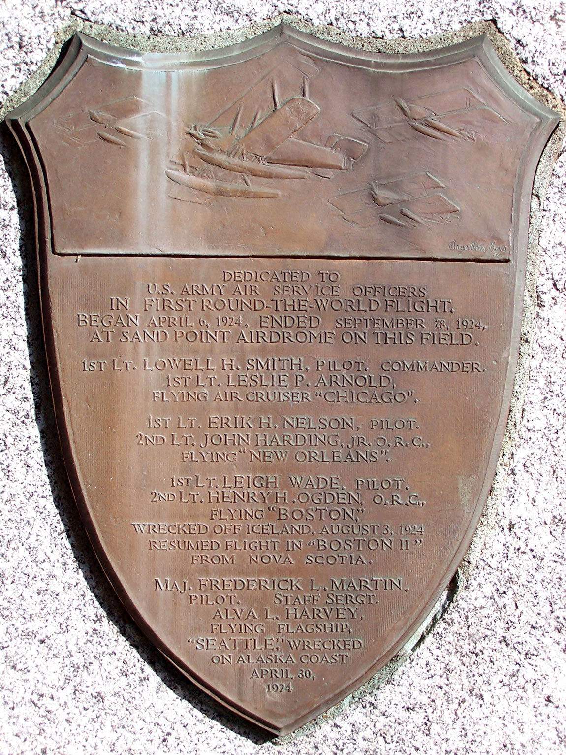 An undated photo of the plaque commemorating Sand Point's 1924 World Flight, which remains at the former entrance of NAS Sand Point.
