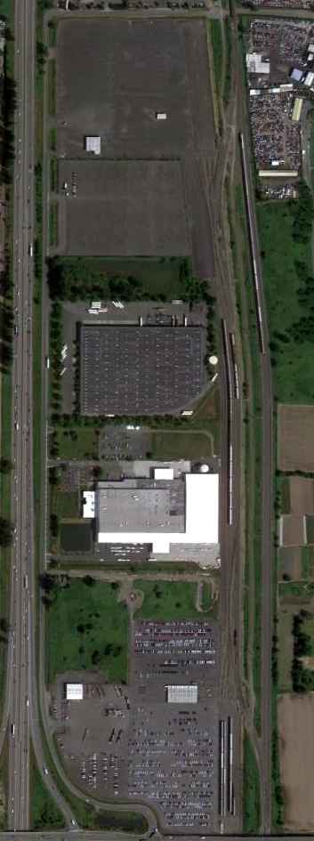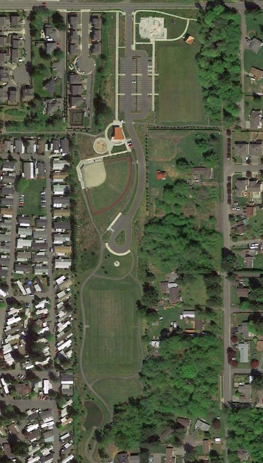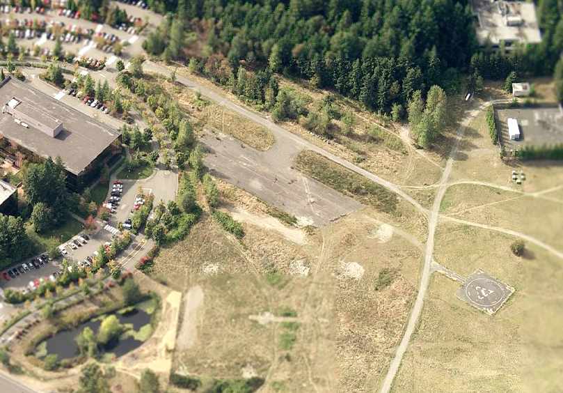 A 2017 aerial view of the site of the original Everett Airport, overlaid by John Clark to show the location of the runway, taxiway, hangar, and office building.