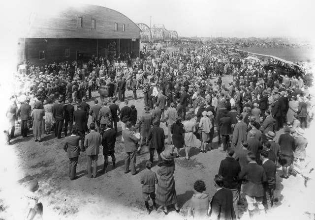 A 4/22/28 photo (courtesy of Arleigh Movitz) of a large crowd attending the dedication of the Ebey Island Airport,