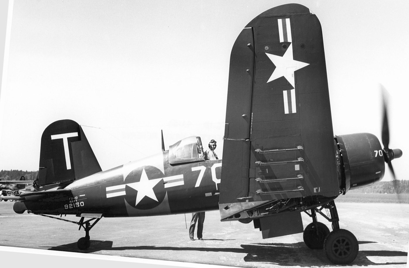 A 1983 photo (courtesy of Lee Corbin) of a Chance Vought F4U Corsair as it was hauled out of Lake Washington. It had ditched off the end of the Sand Point runway & sank in the 1950s.