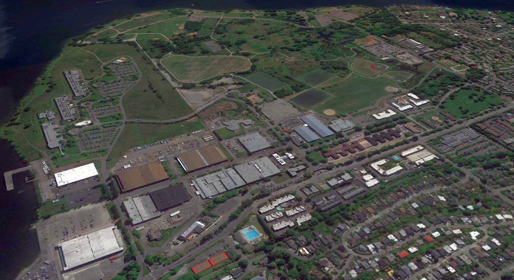 A 2018 aerial view looking southeast at the site of Sand Point NAS.