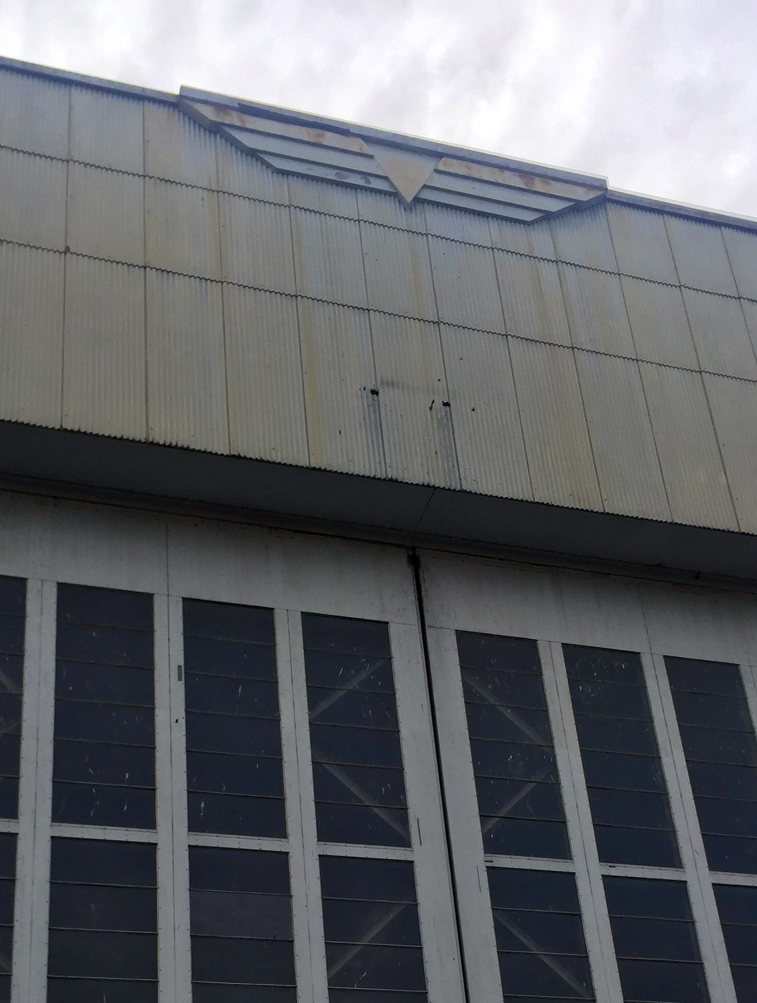 A 6/19/17 photo by Paul Freeman of a crest at the top of a former Sand Point hangar.