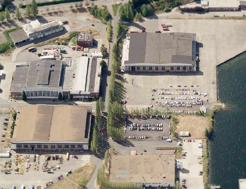 A closeup of the Sand Point hangars from the 6/5/21 aerial view looking southwest by Tim Nelson, author of Jet City Rewind.