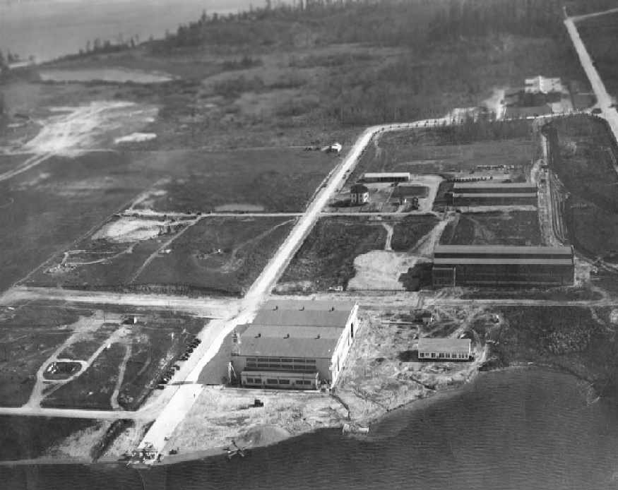 A circa 2005 aerial photo looking west, at the southern-most former hangar at Sand Point.