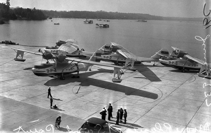 A 5/25/51 view of a PBY Catalina amphibian being maneuvered onto ramps at Sand Point (U of WA Libraries, courtesy of Rex Ricks).