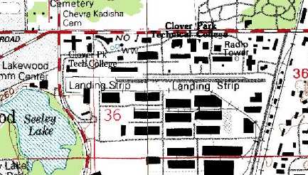 The 1961 USGS topo map depicted Spanaway Airport as as a north/south unpaved runway, labeled generically as “Landing Strip”, with a few small buildings on either side.