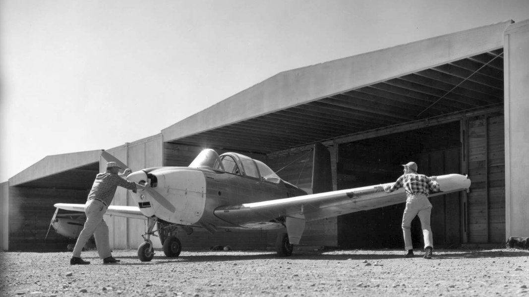 These are believed to be some of the 10 new T-hangars built by C.E. Munson, contractor, which held 5 planes to a side.