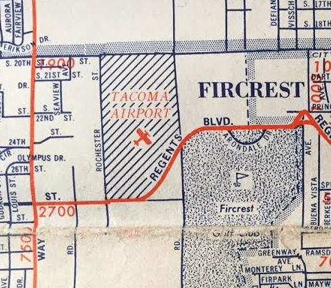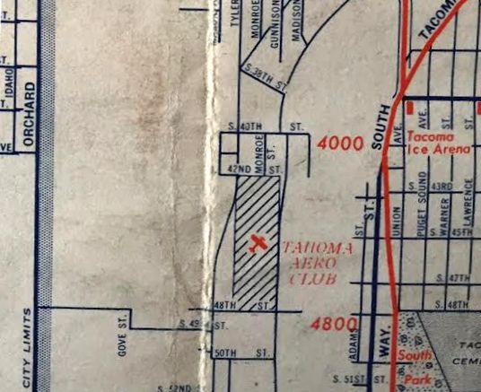 South Tacoma Airport was labeled “Tacoma Aero Club” on a 1958 street map (courtesy of Kevin Walsh),