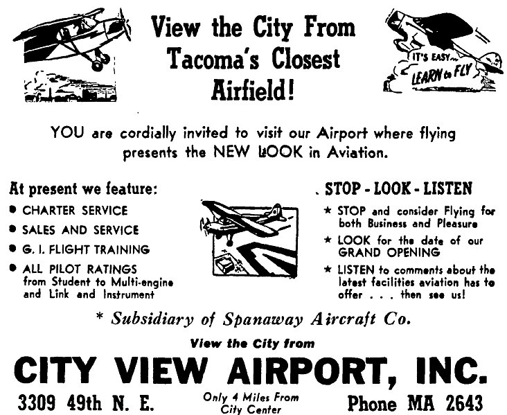 The October 1948 Seattle Sectional Chart (courtesy of Chris Kennedy) depicted “Tacoma Airpark” as having a 3,500' unpaved runway,