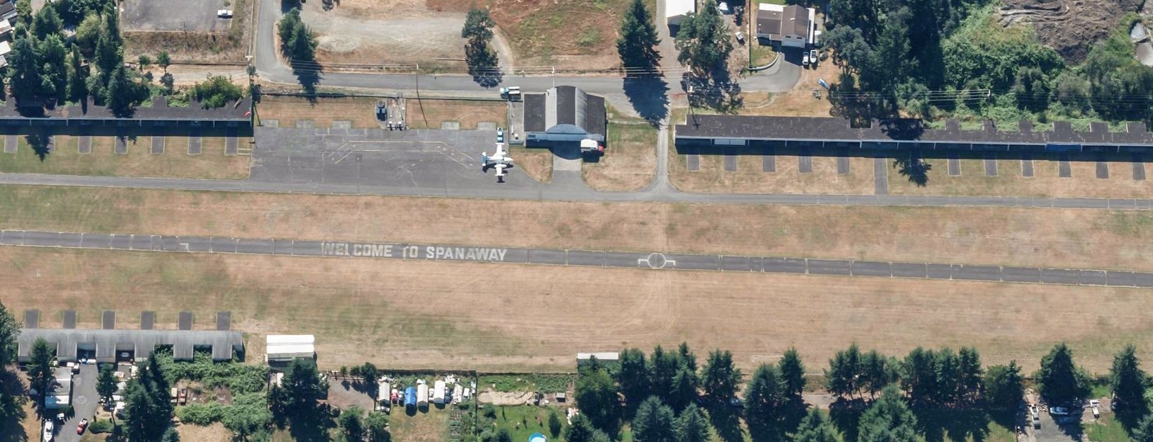 A 1991 USGS aerial view looking northwest depicted Spanaway Airport as having an extremely narrow paved north/south runway, painted with “Welcome to Spanaway” on its midpoint.