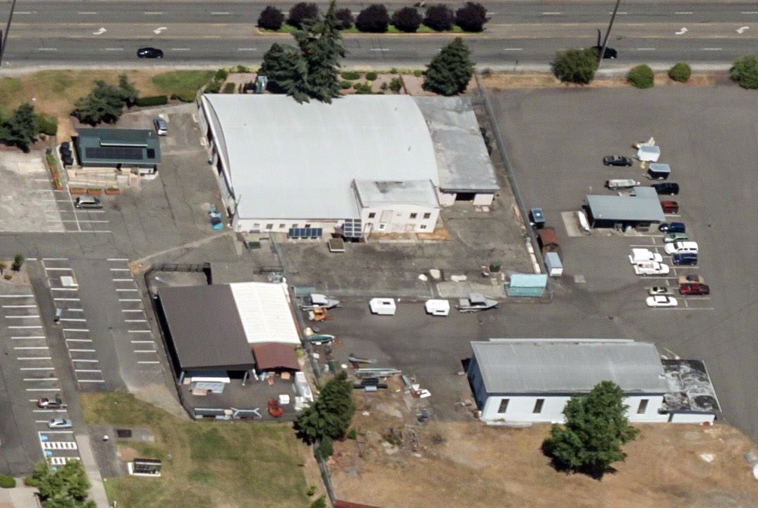 A circa 2010-2018 aerial view looking west depicted Spanaway Airport as remaining intact, but only 1 aircraft (a light twin-engine Cessna) was visible on the ramp, next to the main hangar.