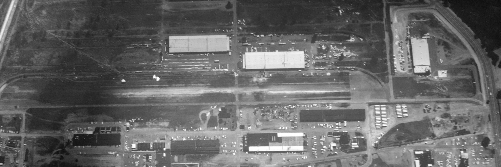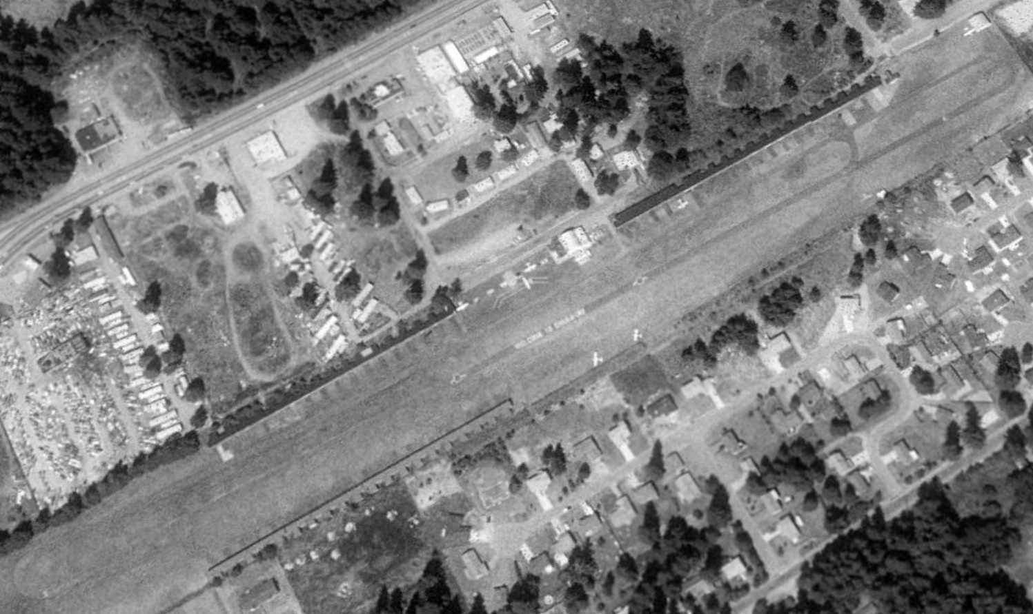 In a 1990 aerial photo of the site of South Tacoma Airport, remains of the former runway pavement were still barely visible.