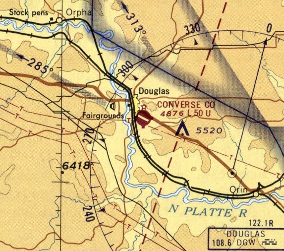 The last aeronautical chart depiction which has been located of Wardwell Field was on the April 1952 Casper Sectional Chart.