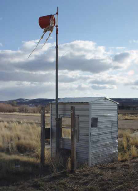 A circa 2016 photo by Marcus Huff (courtesy of the Northern Wyoming News, used with permission) of a remaining abandoned hangar at the site of Ten Sleep Airport.